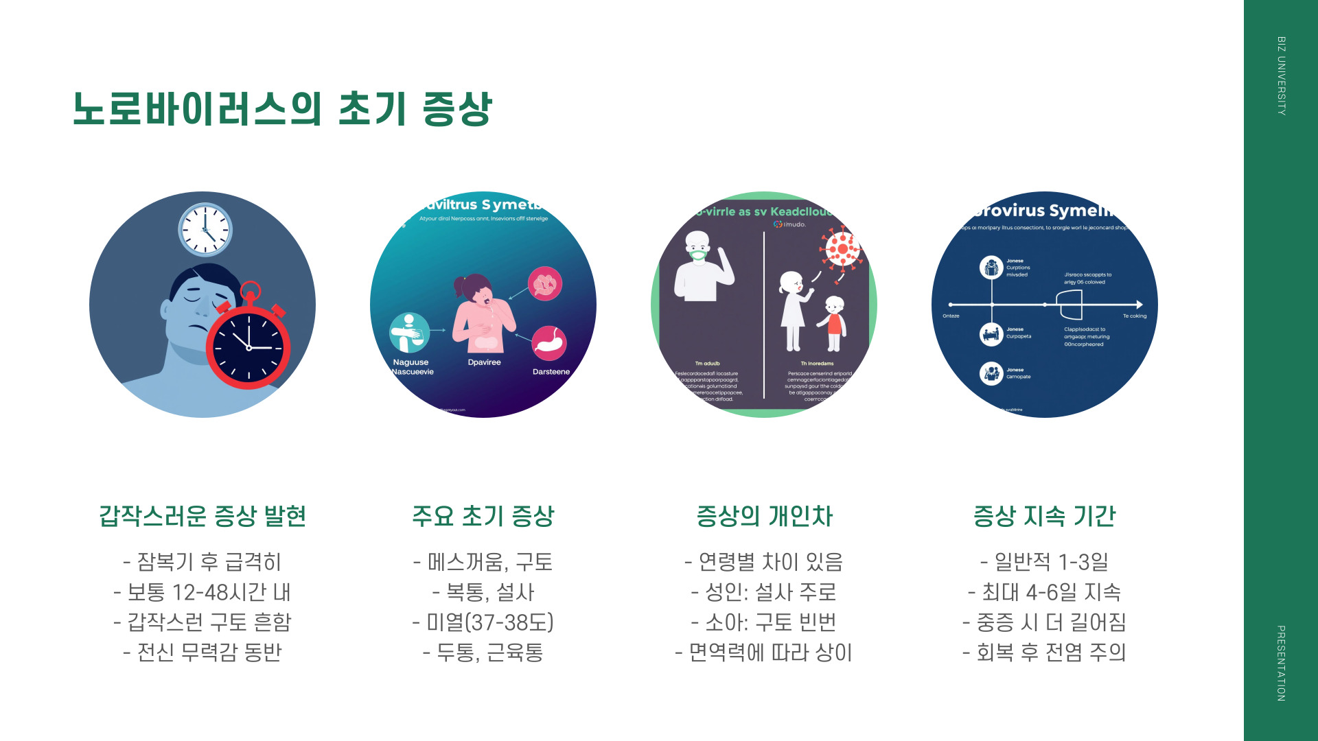 이 시기에 나타날 가능성이 있는 증상은 다양합니다. 감기와 비슷하게 시작될 수 있지만, 다음과 같은 주요 증상들이 포함될 수 있습니다: 구토, 설사, 복통, 그리고 발열 등이 있습니다. 이 증상은 초기 노로바이러스 감염을 의심하게 만듭니다.
