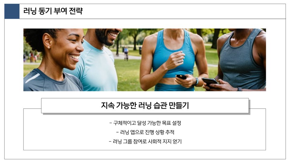 중요 팁: 초보자는 20~30분 간 저강도 러닝부터 시작하고, 점차 시간을 늘려가는 것이 좋습니다.