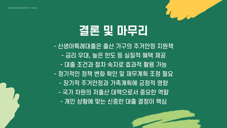 신생아특례대출은 신생아를 가진 가구에게 큰 도움이 되는 금융상품입니다. 저렴한 금리와 유연한 상환 조건 덕분에 많은 가구가 집을 구매하거나 전세 계약을 체결하는 데 유용하게 사용할 수 있습니다. 이러한 기회를 통해 보다 안정적인 가정 환경을 조성할 수 있기를 바랍니다.