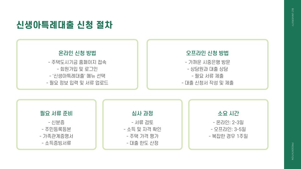 신청 후에는 심사를 거쳐 대출 승인 여부를 통보받게 됩니다. 심사 기간은 금융기관에 따라 다를 수 있으나 보통 1주일 내외가 소요됩니다. 이럴 때, 신생아의 출생 후 얼마의 시간이 지난 후 대출 신청을 하는 것이 가장 유리한지 고려하는 것이 좋습니다. 유의할 점은 신청자가 금융 거래 이력이 양호해야 한다는 것입니다.