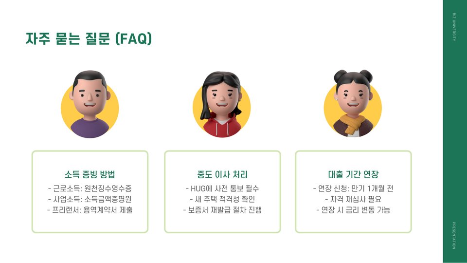 청년버팀목전세대출을 성공적으로 이용하기 위한 몇 가지 팁을 소개합니다. 첫째, 대출 조건을 제대로 이해하고, 자신의 상황에 맞는 상품을 선택하는 것이 중요합니다. 둘째, 필요한 서류는 미리 준비하여 심사 시간을 단축시키는 것이 좋습니다. 마지막으로, HUG의 상담 서비스를 이용하여 궁금한 사항을 해결하는 것도 좋은 방법입니다.