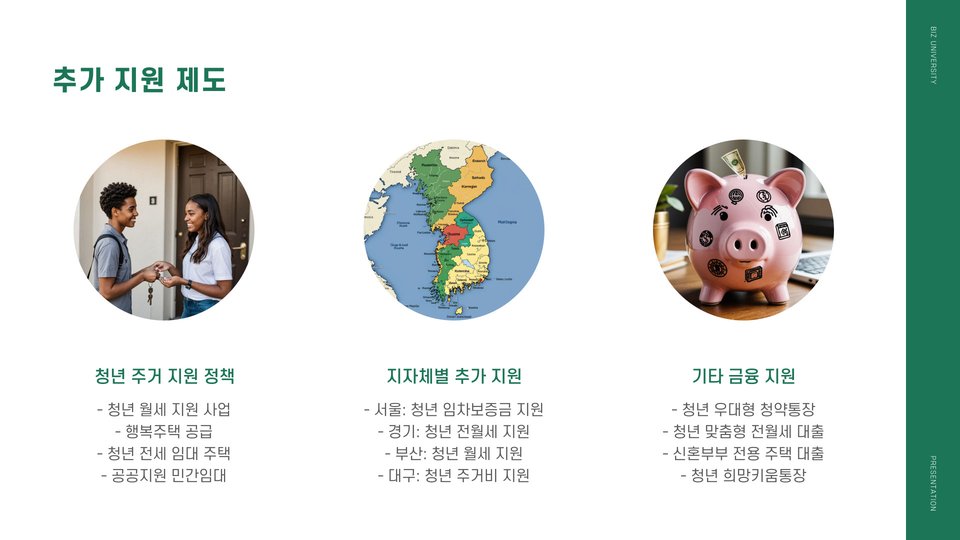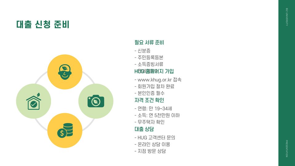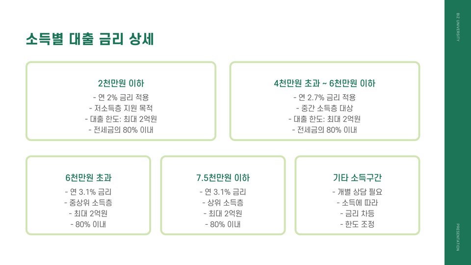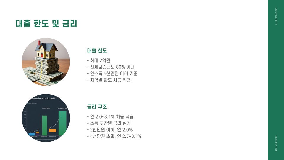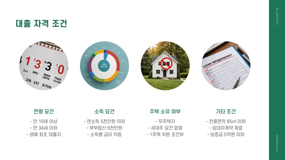 대출은 보통 본인 소득, 주택 임대차 계약 내용, 신청자 연령 등 다양한 조건을 고려하여 진행됩니다. 이때 대출 한도의 최대치는 계약 가격의 일정 비율로, 예를 들어 청년층은 80%까지 가능하다는 점에서 매우 유리합니다. 또한 대출 상품의 이자율은 시장 평균보다 낮은 편이어서 부담 덜한 상환을 가능하게 합니다.