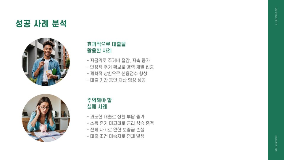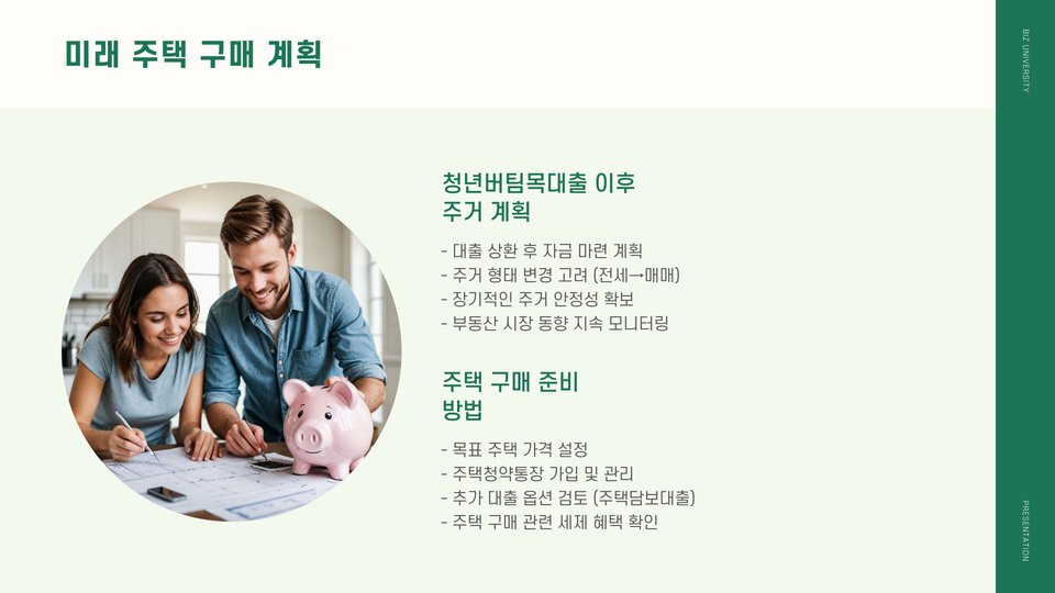 - 주택 선택 및 대출 관리를 철저히 하여 계획적으로 활용하세요.