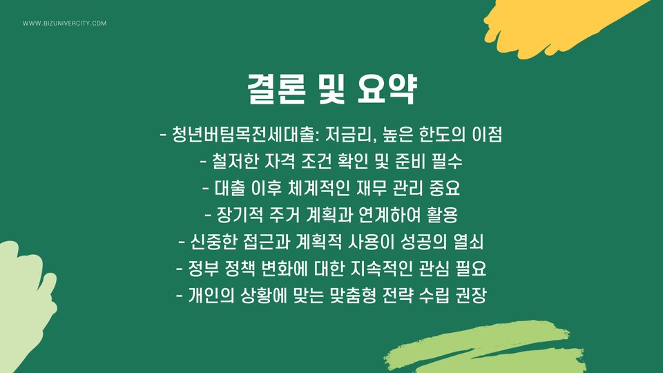 청년버팀목전세대출은 젊은 세대에게 주거 안정을 가져다 주는 매우 유용한 금융 상품입니다. 주거 문제 해결을 위한 첫 걸음이 될 수 있으며, 자신에게 맞는 조건과 이자를 가진 대출을 신중히 선택하면 장기적으로 더 많은 혜택을 누릴 수 있습니다. 재정적인 측면에서 지속 가능한 미래를 위해 이 프로그램을 적극적으로 활용해 보길 권장합니다.