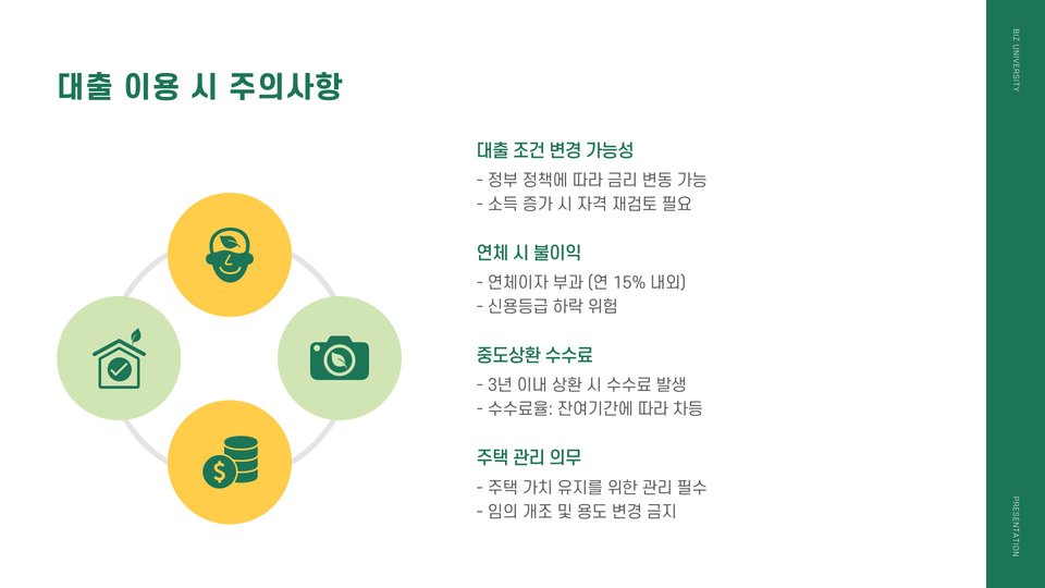 - 주택 선택 및 대출 관리를 철저히 하여 계획적으로 활용하세요.