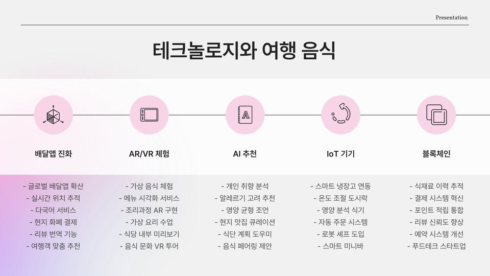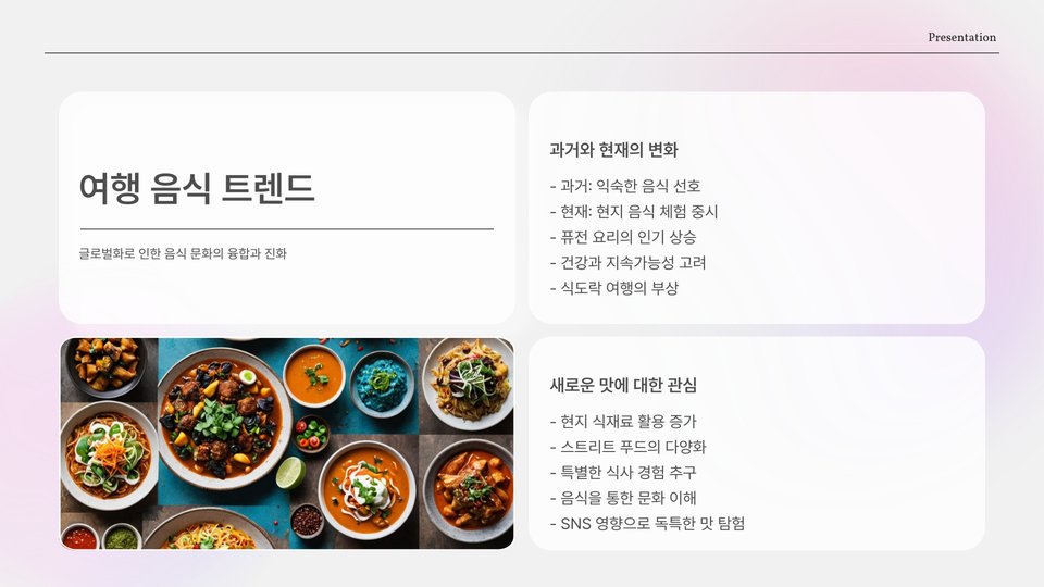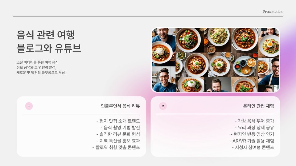 - 여행용 음식 트렌드는 건강식과 퓨전 요리로 발전하고 있다.