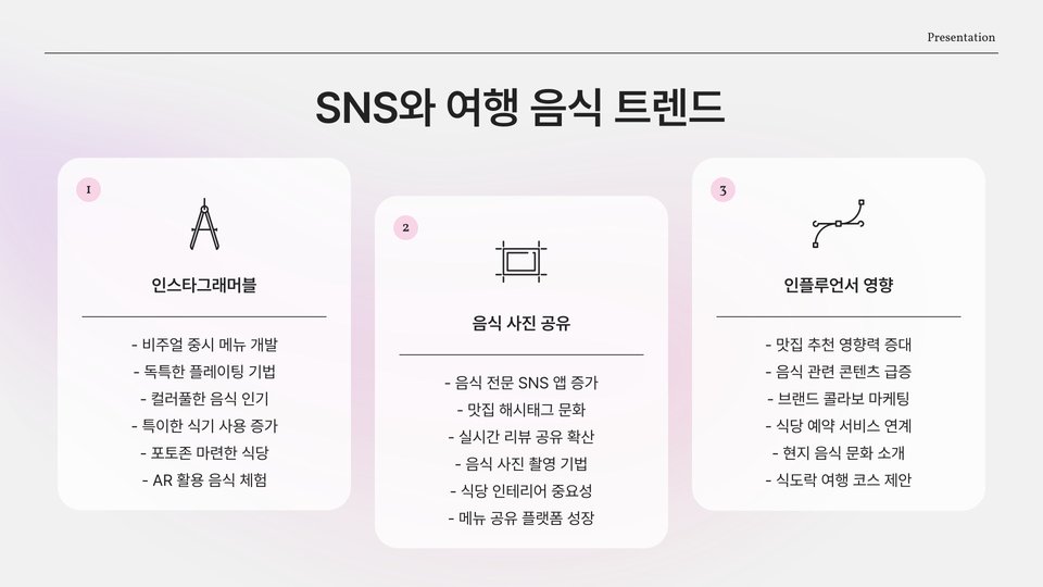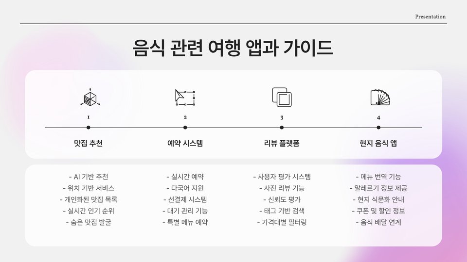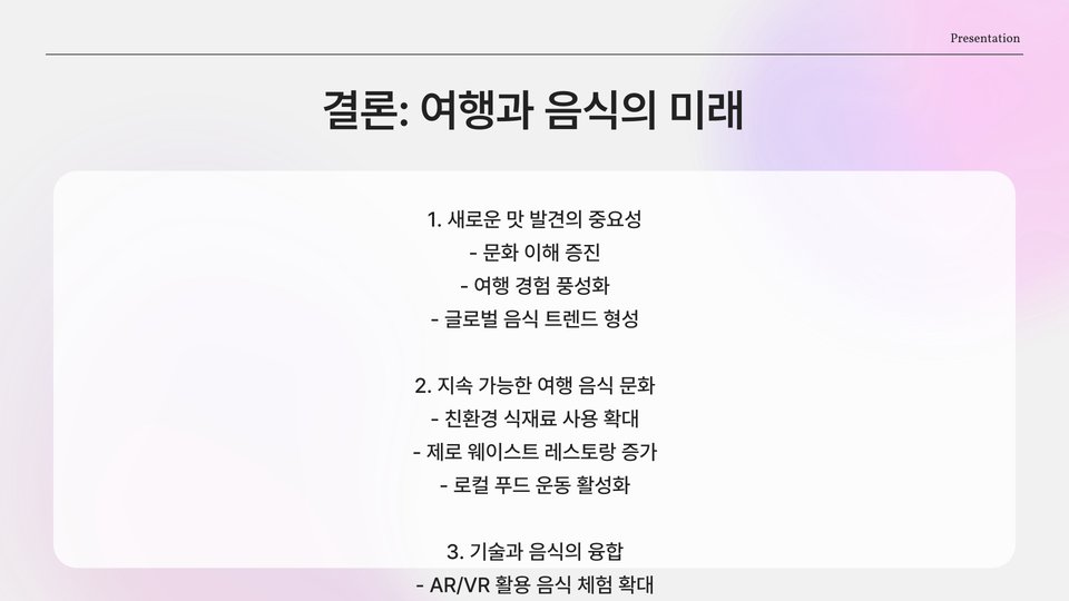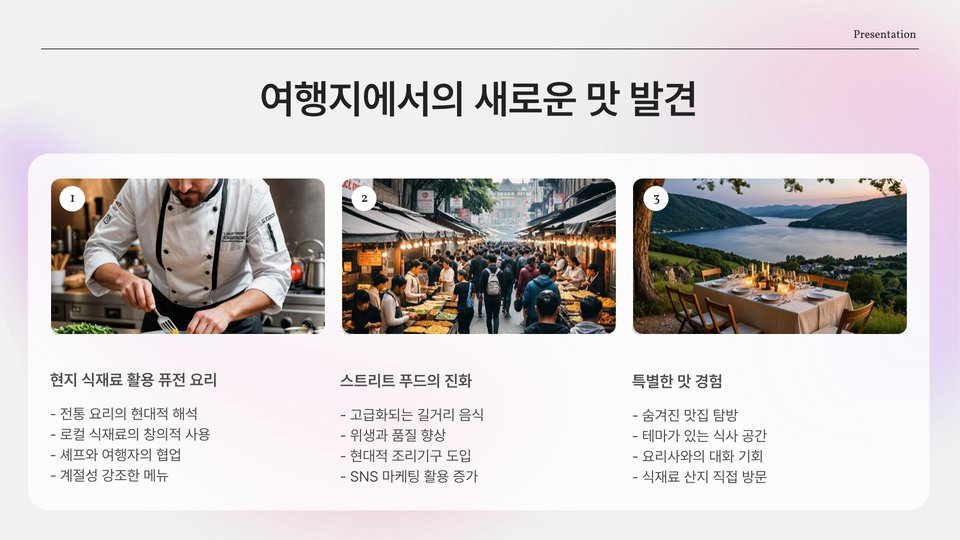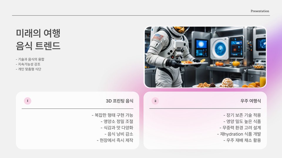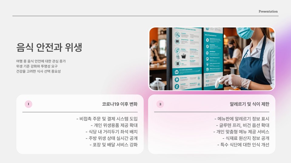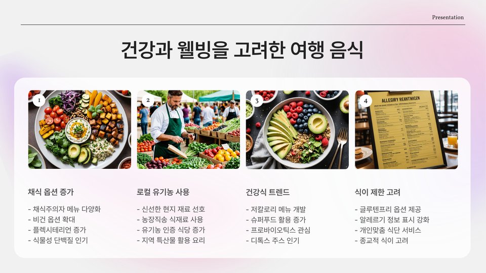 - 여행용 음식 트렌드는 건강식과 퓨전 요리로 발전하고 있다.