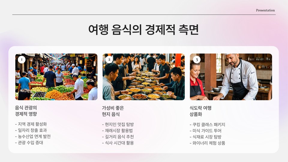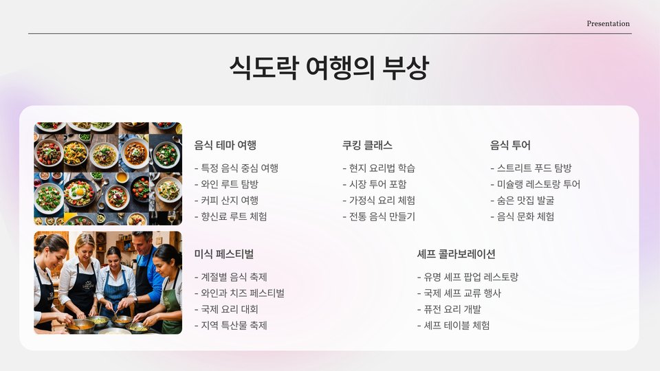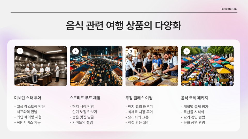 또한, 각 지역을 대표하는 음식 투어가 늘어나고 있으며, 이는 여행자들에게 현지 요리를 보다 깊이 있게 탐닉할 기회를 제공합니다. 예를 들어, 이탈리아의 음식 투어에서는 지역 특산품인 올리브 오일을 체험하고, 정통 파스타를 손수 만드는 과정에 참여할 수 있는 프로그램이 인기를 끌고 있습니다.