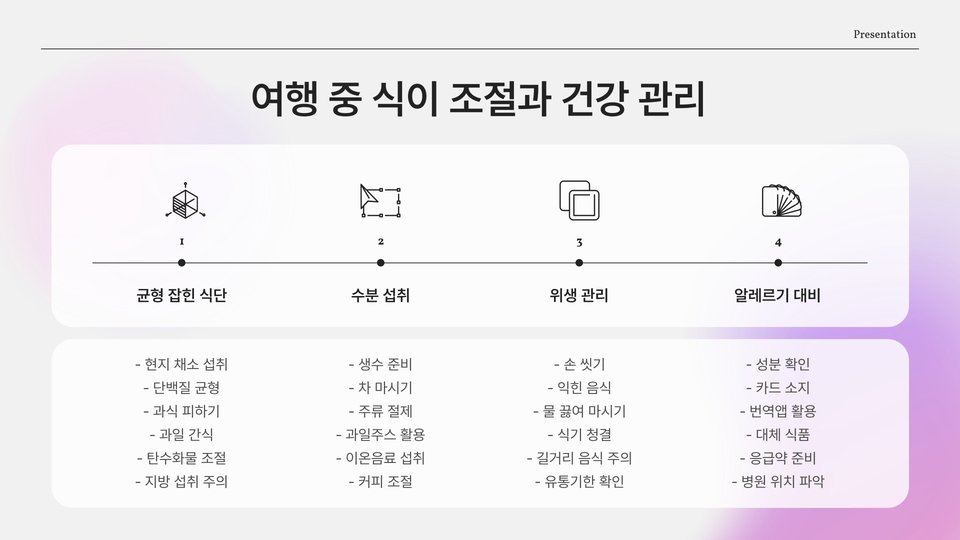 여행 중 음식을 선택할 때는 몇 가지 유용한 팁이 있습니다. 첫째, 미리 조사하기입니다. 가고자 하는 장소의 인기 있는 음식을 사전에 확인하면, 여행 중 새로운 맛을 발견할 확률이 높아집니다. 둘째, 현지인 추천을 받는 것입니다. 현지인의 추천은 항상 신뢰할 만한 정보를 제공합니다. 셋째, 다양한 맛을 시도해보는 것입니다. 여러 가지 음식을 조금씩 맛보며 여행의 재미를 더할 수 있습니다.