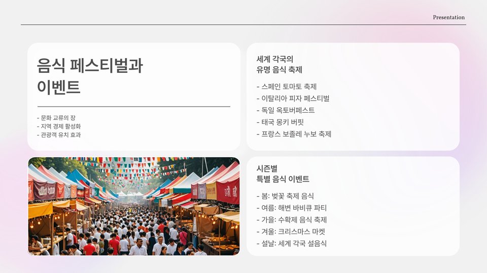 - 다양한 문화의 음식을 경험하는 것이 주요 테마가 되고 있다.