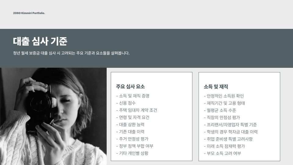 다양한 대출 옵션이 존재하는 가운데, 청년들은 자신의 소득 수준, 상환 능력, 그리고 필요한 자금을 기준으로 적합한 상품을 선택해야 합니다. 이를 위해서는 각 금융기관의 대출 조건과 이자율 등을 충분히 비교하고 분석하는 것이 중요합니다. 청년 월세 보증금 대출은 주거 안정성을 높이는 것 외에도 청년들의 미래를 보장하는 중요한 도구가 되고 있습니다.