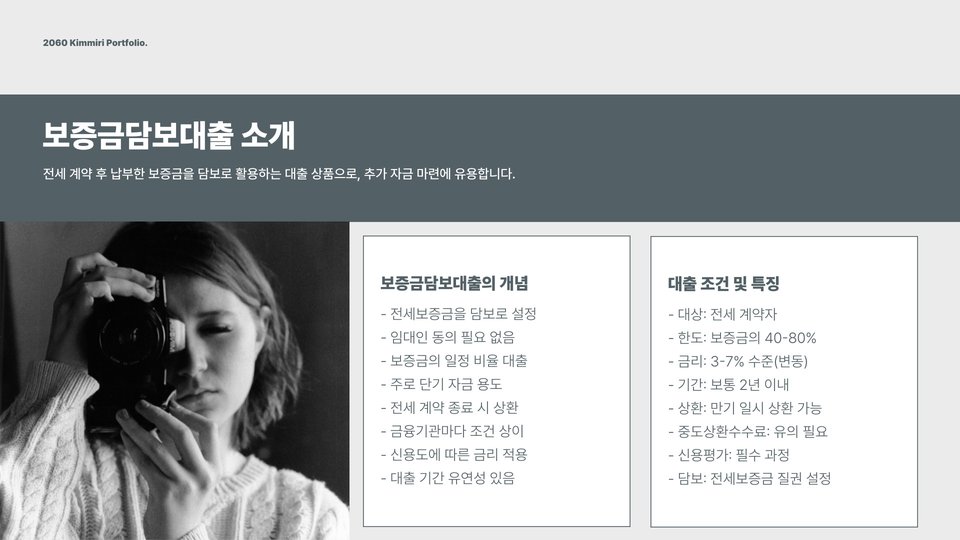 - 보증금담보대출은 부동산을 담보로 하여 대출을 받는 방식으로, 대출 한도가 높음.