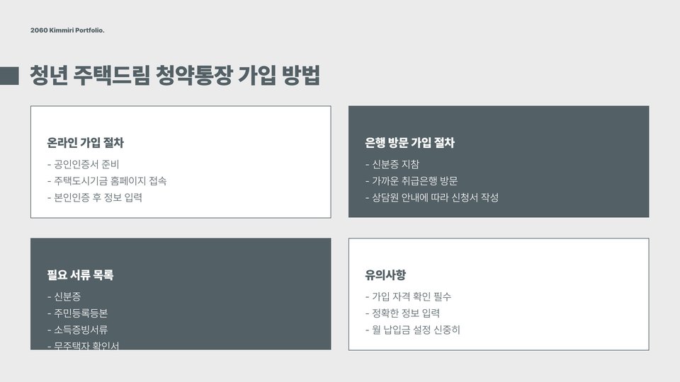 청년 주택드림 청약통장에 가입하기 위해서는 몇 가지 조건을 충족해야 합니다. 첫째, 가입자는 만 19세 이상 39세 이하의 청년이어야 합니다. 이는 주거 안정을 필요로 하는 청년층을 대상으로 하기 위해 설정된 기준입니다. 둘째, 소득 수준이 일정 기준 이하여야 하며, 이는 주택을 구매할 수 있는 여력을 평가하기 위함입니다. 예를 들어, 연소득이 5천만 원 이하인 경우에 해당됩니다.
