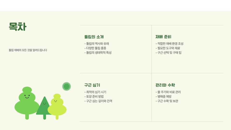 튀립 키우기는 초보자도 쉽게 도전할 수 있는 훌륭한 정원 취미입니다. 적절한 품종 선택, 심기, 기르기 방법을 알고 잘 관리한다면, 매년 아름다운 봄을 맞이할 수 있습니다. 이 가이드를 통해 튤립을 성공적으로 키울 수 있기를 바랍니다. 여러분의 튤립 정원이 아름답게 자라길 기원합니다!