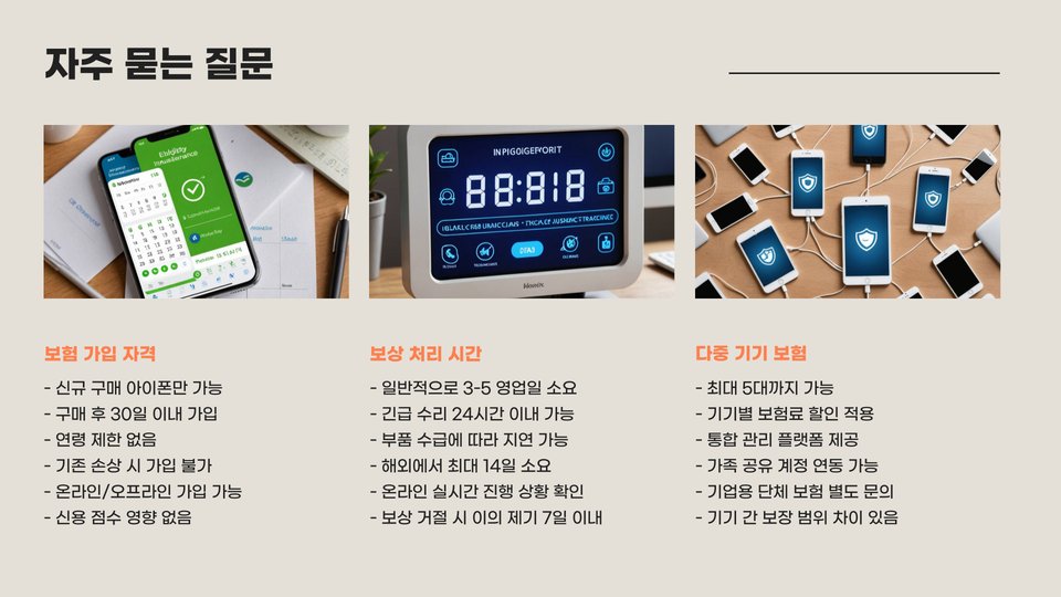 아이폰 보험은 여러 가지 혜택을 제공합니다. 첫 번째로, 손상 보호가 있습니다. 화면이 깨지거나 기기가 물에 빠졌을 때, 보험을 통해 수리비를 일부 또는 전부 지원받을 수 있습니다. 두 번째로, 분실 보상입니다. 아이폰을 잃어버렸을 경우, 보험사가 새로운 기기를 제공하거나 보상금을 지급하여 경제적 부담을 덜어줍니다. 마지막으로, 도난 보상이 있습니다. 도난당한 아이폰에 대해 적절한 보상을 받을 수 있기 때문에, 안전한 사용이 가능합니다.