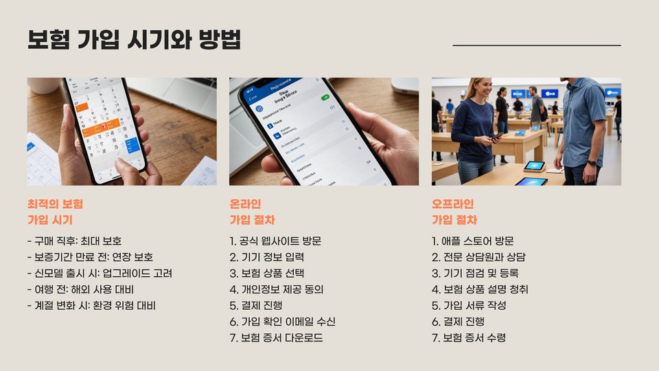 아이폰 보험에 가입하는 방법은 간단합니다. 첫째, 온라인 신청을 통해 쉽게 가입할 수 있습니다. 여러 보험사의 웹사이트를 방문하여 조건을 비교한 후, 원하는 상품을 선택하면 됩니다. 둘째, 오프라인 대리점 방문도 가능합니다. 보험 대리점을 직접 방문하여 상담을 받고 가입할 수 있습니다. 마지막으로, 보험 가입 후 관리도 중요합니다. 가입한 보험의 조건과 보장 내용을 주기적으로 확인하여 필요한 경우 보장을 업데이트하는 것이 좋습니다.