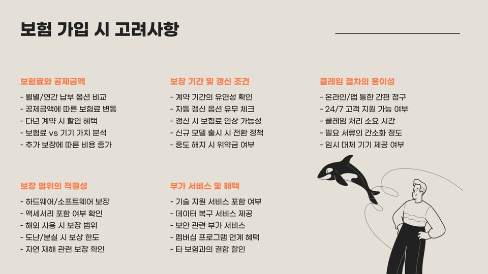 또한, 보험 서비스에 따라 24시간 고객 지원을 제공하기도 합니다. 이 서비스는 고객이 언제든지 문제를 해결할 수 있도록 도와주며, 사고 발생 시 빠르게 대응하여 기기를 최대한 빨리 복구할 수 있는 기회를 제공합니다.