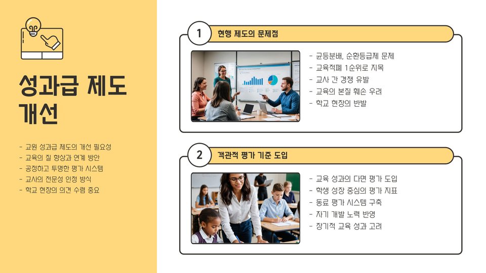 교원 급여에 성과급 제도를 도입하는 방안이 논의되고 있습니다. 이를 통해 교사들의 노력이 경제적으로 보상받을 수 있습니다. 성과가 좋은 교사들에게는 인센티브를 제공함으로써 교육의 질을 높이고, 교사들의 자발적인 참여를 유도할 수 있는 방안입니다.