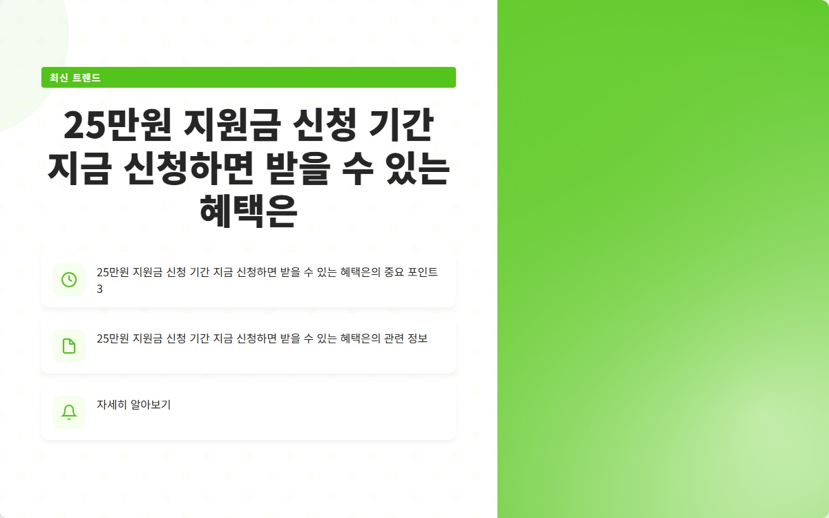 2025년의 25만원 지원금 신청 기간이 다가오고 있습니다. 이 지원금은 많은 국민들이 어려운 경제 상황 속에서 큰 도움이 될 것입니다. 지금 신청 준비를 해서 혜택을 놓치지 마세요!