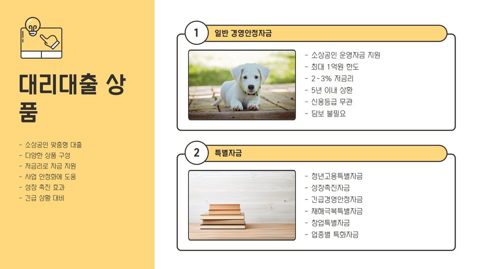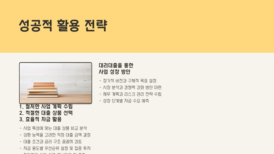소상공인시장진흥공단의 대리대출 프로그램은 소상공인들에게 자금 부족 문제를 해결할 수 있는 유용한 도구입니다. 대출 요청은 각 사업체의 상황에 맞는 대출 상품을 통해 이루어지며, 이를 통해 안정적인 사업 운영이 가능합니다. 대리대출 프로그램을 활용할 경우, 초기 창업 단계에서 자본금 부족을 극복하고, 장기적인 성장 가능성을 높일 수 있습니다.