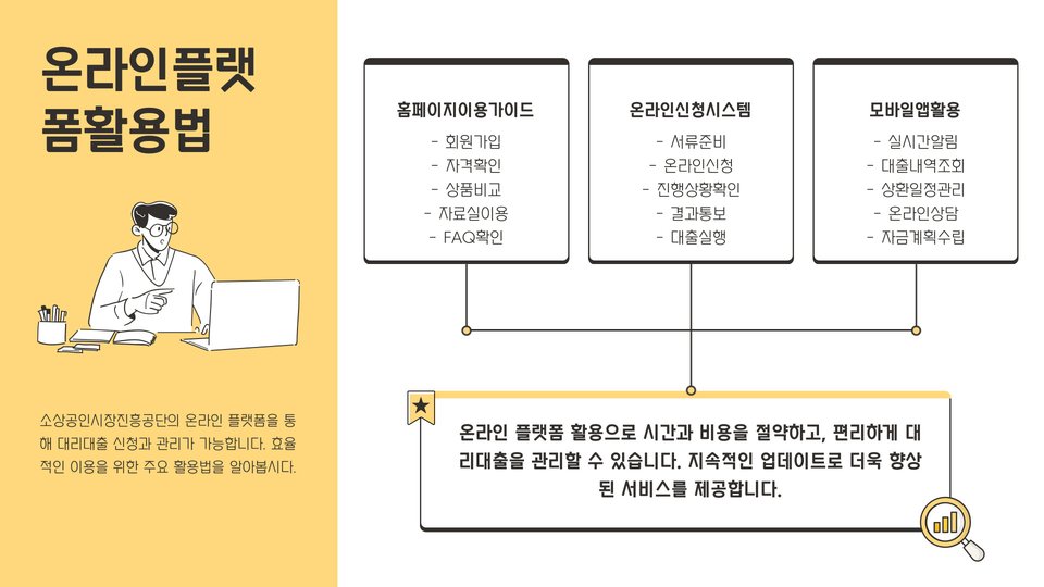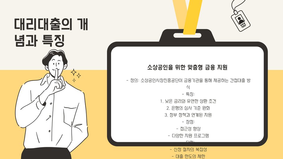 소상공인들은 지역 경제에 매우 중요한 역할을 합니다. 그들은 많은 일자리를 창출하며 다양한 서비스를 제공합니다. 그러나 자금 부족이라는 문제가 그들의 성장을 가로막는 주요 원인 중 하나입니다. 초기 창업 단계에서 소상공인들은 자본금 부족과 갑작스러운 경제적 상황으로 인해 심각한 재정적 어려움을 겪습니다. 이러한 상황에서 소상공인시장진흥공단의 대리대출 지원 프로그램은 그들에게 큰 도움이 될 수 있습니다.