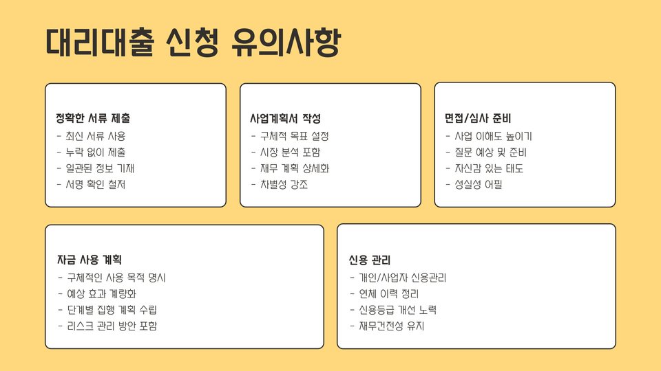 대리대출을 선택할 때는 여러 요소를 고려해야 합니다. 첫째, 이자율은 대출 비용에 직접적인 영향을 미치므로 가장 중요한 요소입니다. 둘째, 상환 기간도 중요한데, 긴 상환 기간은 매달 부담을 줄여줍니다. 셋째, 대출 한도도 사업의 규모에 따라 달라지므로 미리 확인해야 합니다. 마지막으로, 신청 절차의 간편함도 중요한 선택 기준이 될 수 있습니다.