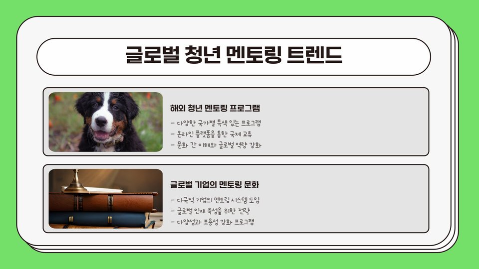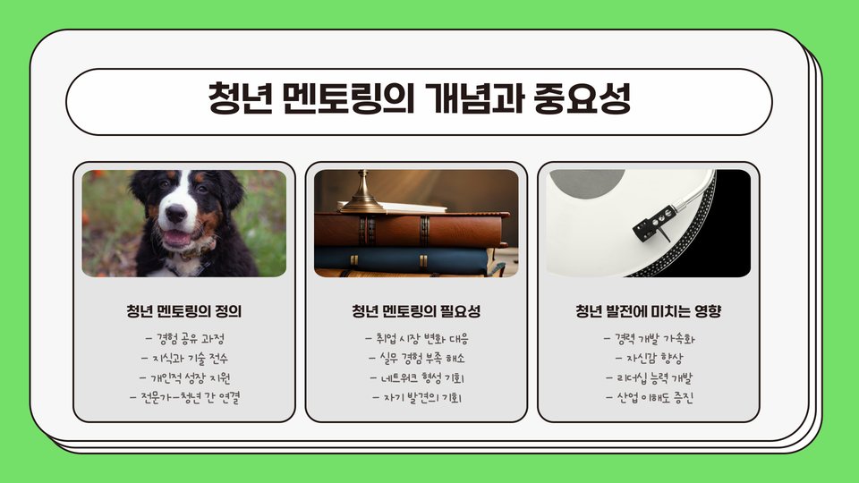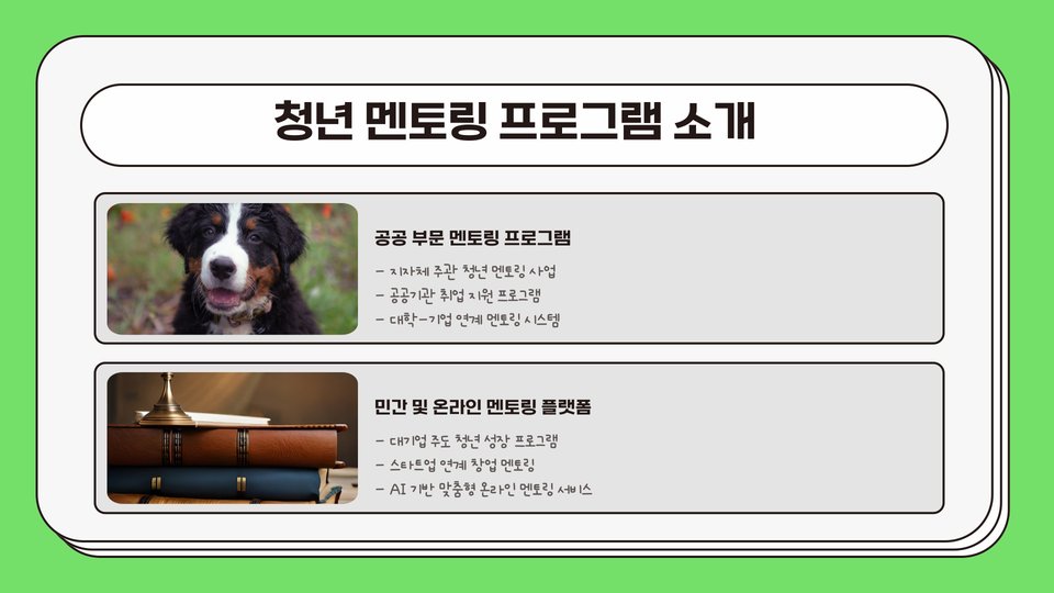 지난 몇 년간 멘토링 관계를 통해 얻은 경험은 항상 인생의 방향을 결정짓는 중요한 기회로 작용해 왔습니다. 그러므로, 청년 멘토링에 대한 이해를 깊이 하고, 필요한 자원으로 활용하여 더 밝은 미래를 설계해 나가기를 바랍니다.